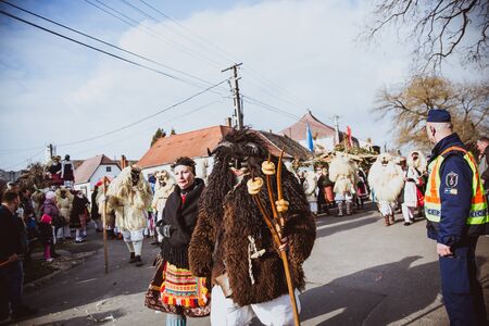 Hungary Mohacs Feb 23 2020: Participants at the Buso walking festival-ending the day before Ash Wednesday. People wearing traditional masks include folk music, masquerading, parades and dancing.