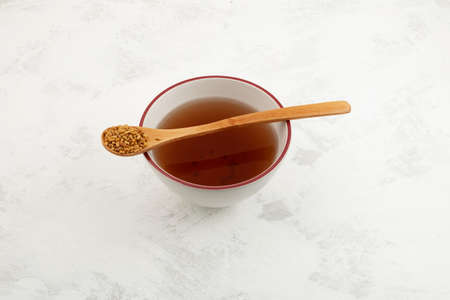 Fenugreek Seeds in wooden spoon and Methi Dana drink in tea bowl. Helpful in weight loss, digestion and blood sugar treatment.
