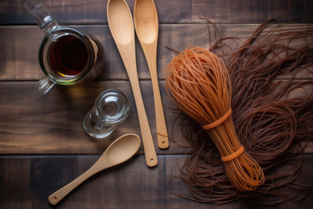 a wooden spoon and whisk flatlay against a wooden background, created with generative ai