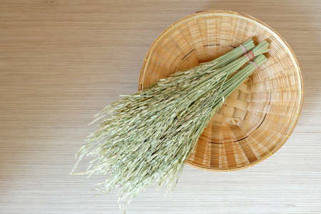 Rice paddy grain on the woven basket with timber background