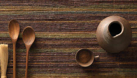 Overhead view of wooden spoons and a ceramic vase on a woven placemat with a striped pattern. The spoons and vase are positioned centrally on the mat, and there is a small, round bowl with spice or granules located between the vase and spoons.