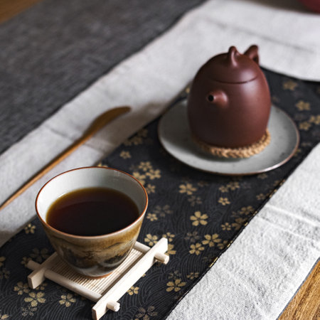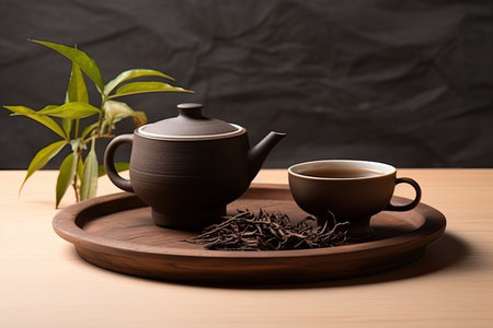 Traditional tea drinking with black puer tea on a minimalistic beige backdrop.