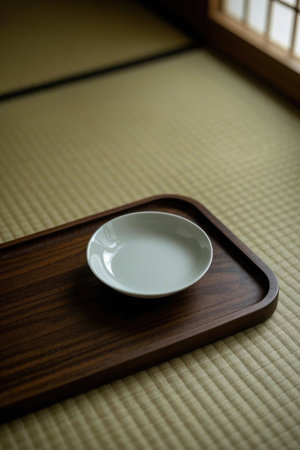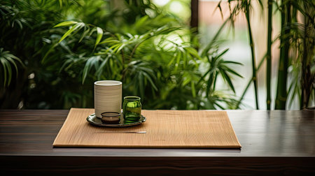 A serene scene depicting a traditional tea ceremony, featuring handmade cups and a straw hat on a bamboo mat surrounded by natural decor elements.