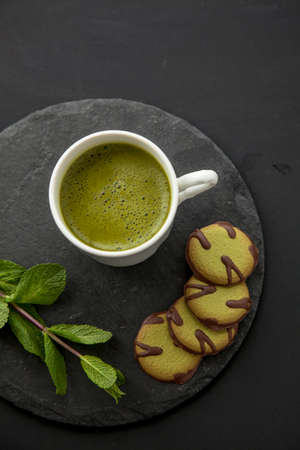 Green composition with match tea and cookies for healthy breakfast