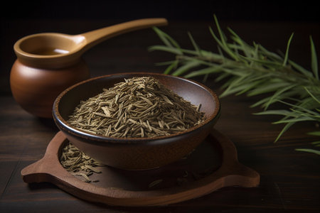 Thymus - Raw dry thyme herb on wooden spoon