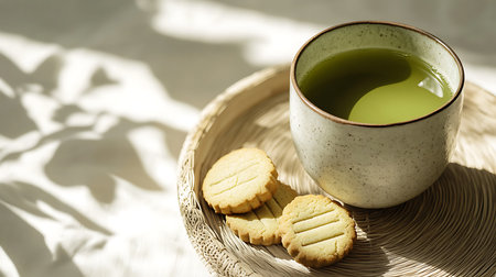 Generative AI Image of Warm Green Tea Matcha Drink with Soft Cookies and Light Shadow Background
