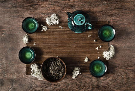 Dark turquoise glazed clay teapot and small cups on dark wooden background with bamboo mat decorated with white flowers. Creative minimalist tea ceremony concept. Copy space, top view.