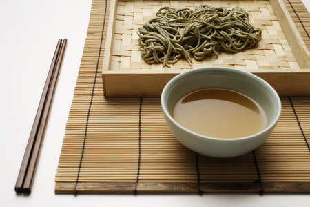 cooked soba noodles with sauce on bamboo tray and chopstick setting