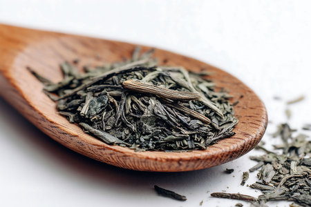 Tea leaves on a wooden spoon on a white background