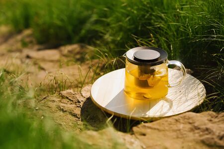 Cool refreshing drink on the background of nature and green trees
