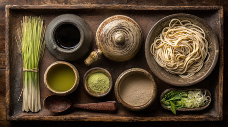 A captivating overhead display of essential Japanese cooking ingredients meticulously arranged on a wooden tray, showcasing the beauty of culinary tradition and artistry.