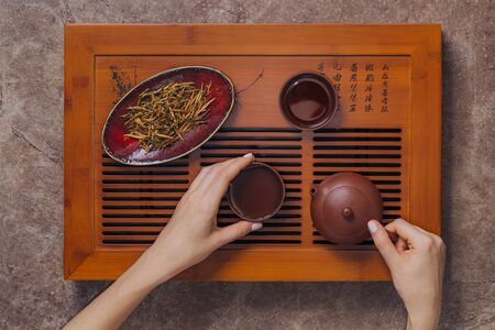 Flat lay Chinese tea ceremony. The woman holding a cup of tea and teapot