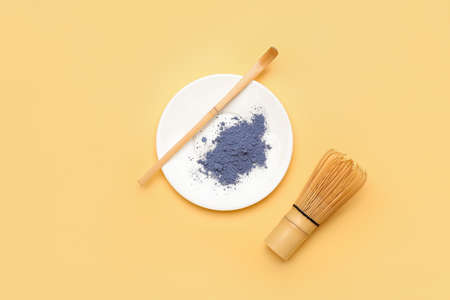 Plate with powdered blue matcha tea, chashaku and chasen on color background