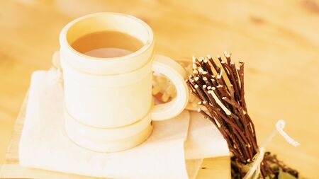 Cup of herbal tea on wooden table