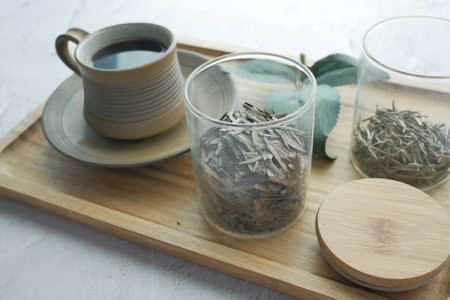 green tea and Dry tea leaves on table