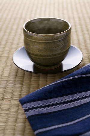 Background of a ceramic ware Chawan Cup of Japanese Matcha green tea on a tatami mat covered with woven soft rush straw in a traditional Japanese-style room.