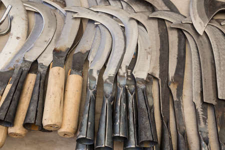 The old sickle and hand of man and in a rice field. Harvesting, respecting traditions. Close up.
