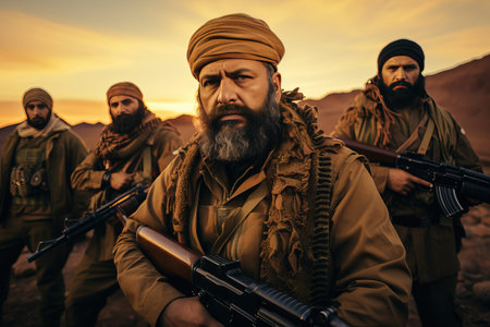 Selective focus image of a group of naga tribesmen dressed in their traditional attire celebrating a victory by lifting their weapons in Kisama village Nagaland India on 4 December 2016