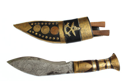 Antique Knife From Nepal on White Background Writing on Coins is government issue coin and monetary denomination
