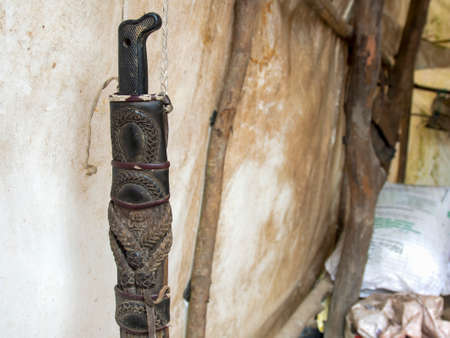 A typical colombian machete in its richly decorated leather holster hanging in a shed near the town of Arcabuco, in central Colombia.