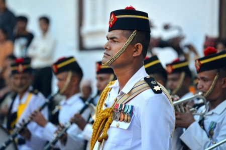 KATHMANDU - OCT 11 The Nepalese Military Orchestra performing live in the inner courtyard of the Royal Palace, during the Dasain festival On October 11, 2013 in Kathmandu, Nepal