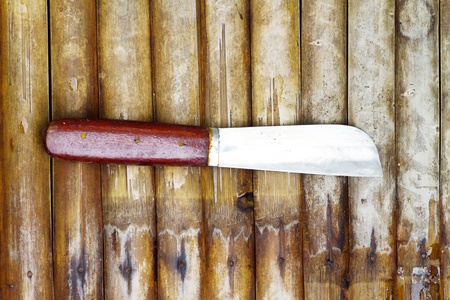 Large knife in leather and natural wood grain casing on table background handmade fo Thailand