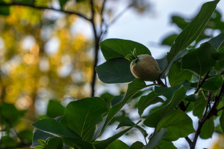 ripening quince fruit. colorful photo. natural beauty. space for text. close-up. screensaver. blurred background with highlights and bokeh. Cydonia. Cydonia oblonga. Rosaceae.