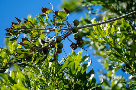 Hard green Australian macadamia nuts hanging on branches on big tree on plantation