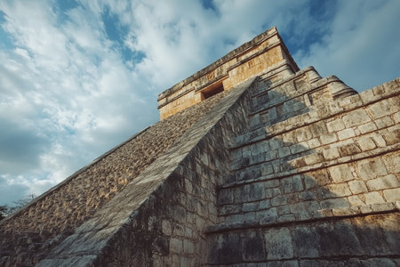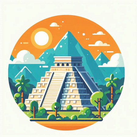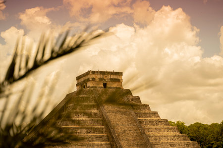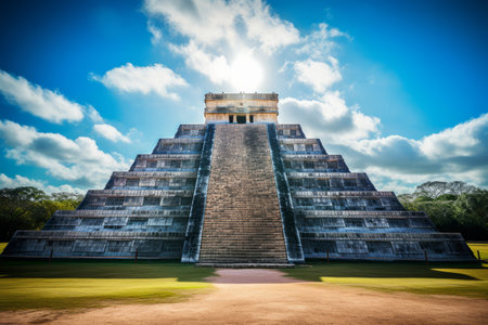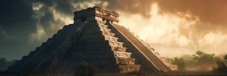A majestic pyramid stands tall, a testament to the ancient Mayan civilization. Its intricate structure and weathered stone whisper tales of a bygone era.