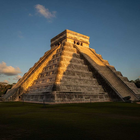 Sunlight bathes the ancient Kukulkan pyramid at Chichen Itza, Mexico, a testament to Mayan ingenuity and a world-renowned archaeological site