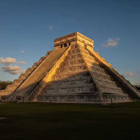 The ancient Mayan pyramid of Kukulkan stands majestically against a clear blue sky at sunset