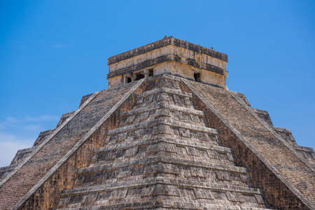 Mayan pyramid of Kukulcan against blue sky at Chichen Itza- Mexico