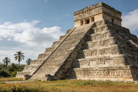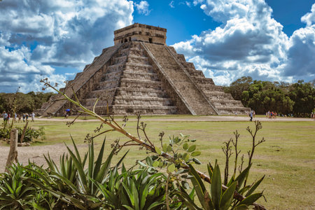 El castillo, temple of kukulcan, rising above the green yucatan landscape in chichen itza, mexico, a testament to mayan ingenuity under a vibrant sky