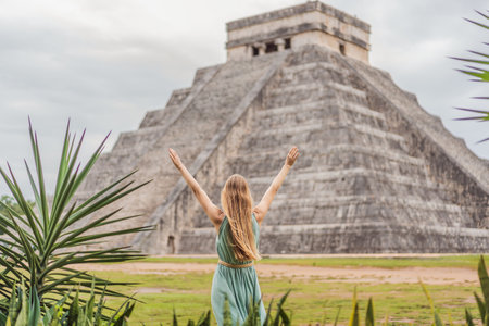 Beautiful tourist woman observing the old pyramid and temple of the castle of the Mayan architecture known as Chichen Itza these are the ruins of this ancient pre-columbian civilization and part of humanity