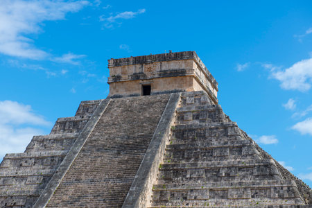 Closeup of Temple of Kukulkan Pyramid (El Castillo) in Chichen Itza ruins, one of the Seven Wonders of the World and UNESCO World Heritage Site