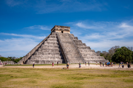Chichen Itza, Mexico - Dec. 23, 2019: Tourists visit the famous Kukulcan pyramid at Chichen Itza in the Yucatan Peninsula of Mexico. A UNESCO World Heritage Site, it is also one of the New Seven Wonders of the World.