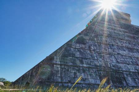 A low angle shot of the Temple of Kukulcan with the bright sun above its tip at Chichen Itza, Yucatan State, Mexico