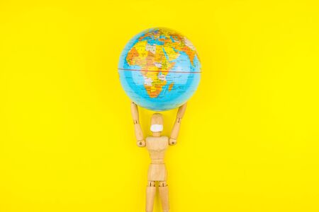 Wooden figure mannequin carrying planet earth globe over head on a yellow background.