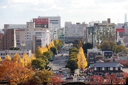 Himeji, Hyogo, Kansai, Japan November 19, 2017: View Landscape of Himeji city with street and autumn tree on sky background.