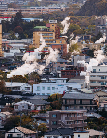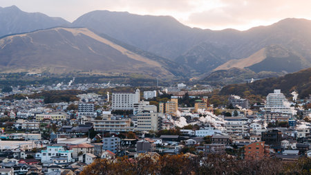 Beppu, Japan, city panorama skyline, Kannawa onsen distict, Oita prefecture, Kyushu island region,, Yukemuri observation deck, rising hot steam from onsen ryokan bath houses, Beppu resort hot springs