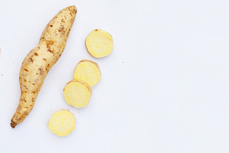 Raw sweet potato yam isolated on white table background.