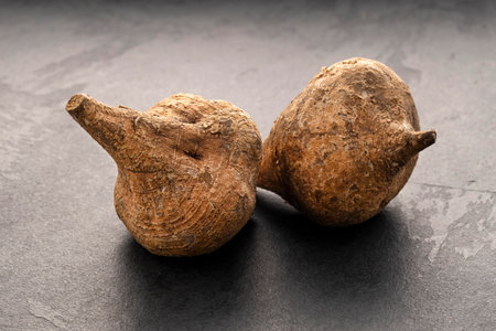 AI Generated. Fresh cassava tubers on a textured surface showcasing their hard skin and roots with ample empty space for text or marketing use