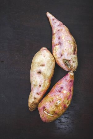 Various sweet potato on wooden background, Imperfectly shape, Food trend