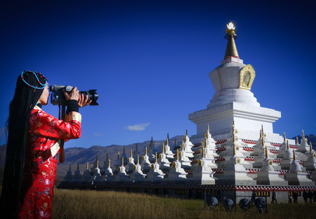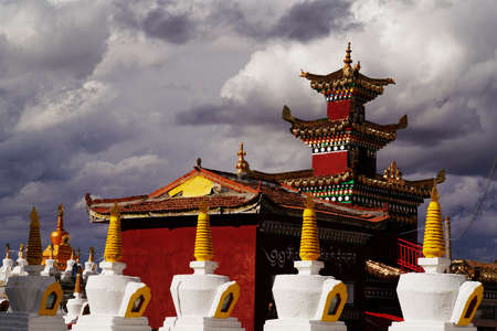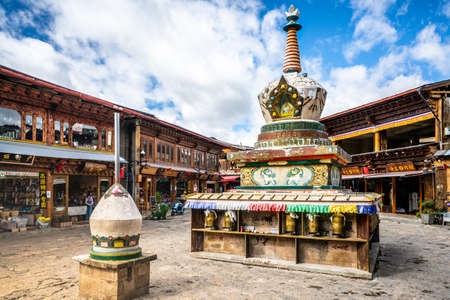 Shangrila China, October 8, 2020: Stupa and old Tibetan houses street view in Dukezong old town in Shangri-La Yunnan China