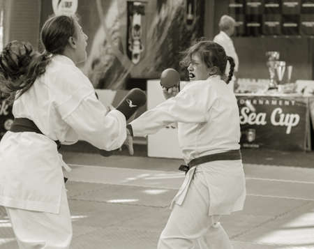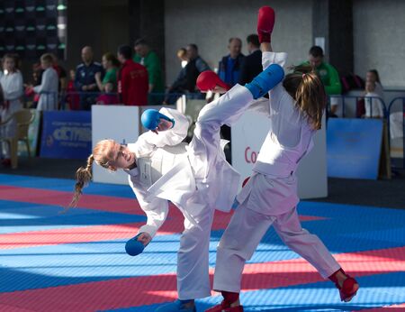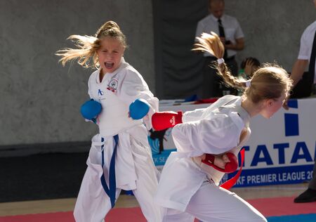 Odessa, Ukraine - September 30, 2019: Karate Championship among children of athletes. The best karate fighters children girls demonstrate their ability to fight on tatami. Battle of karate young girls