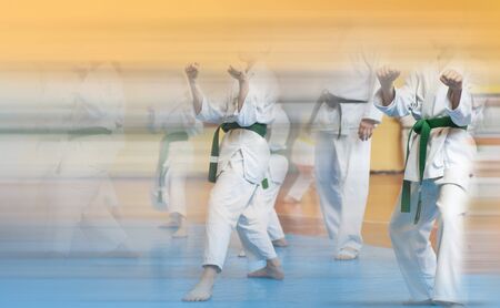 Karate training for children. Practicing a direct punch with a hand. Background photo. Added blur effect for more motion effect.