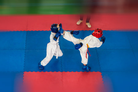 Children's fight of taekwondo athletes on a blue-red tatami with art motion blur.