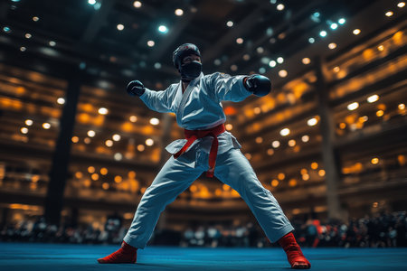 Competitors demonstrate martial arts prowess in a lively arena filled with spectators, as tension builds in this karate tournament taking place in an urban environment at night.