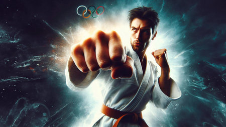 A determined figure stands poised, dressed in white gi with a black belt displaying power and focus.
