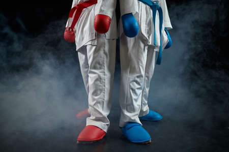 Kids training on karate-do. The karate fighter prepares to strike with his hand. Photo without faces.